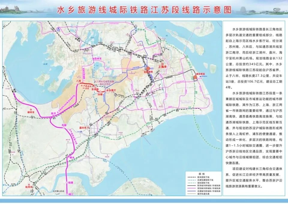 沪苏嘉城际铁路是推进示范区基础设施互联互通的标志性工程,包括上海市境内的上海示范区线,江苏省境内的水乡旅游线,浙江省境内的嘉善至西塘线和嘉兴至枫南线。铁路通车后,两区一县的时空距离将大大缩短,进一步增强示范区1小时生活圈活力,实现交通出行“同城化”。