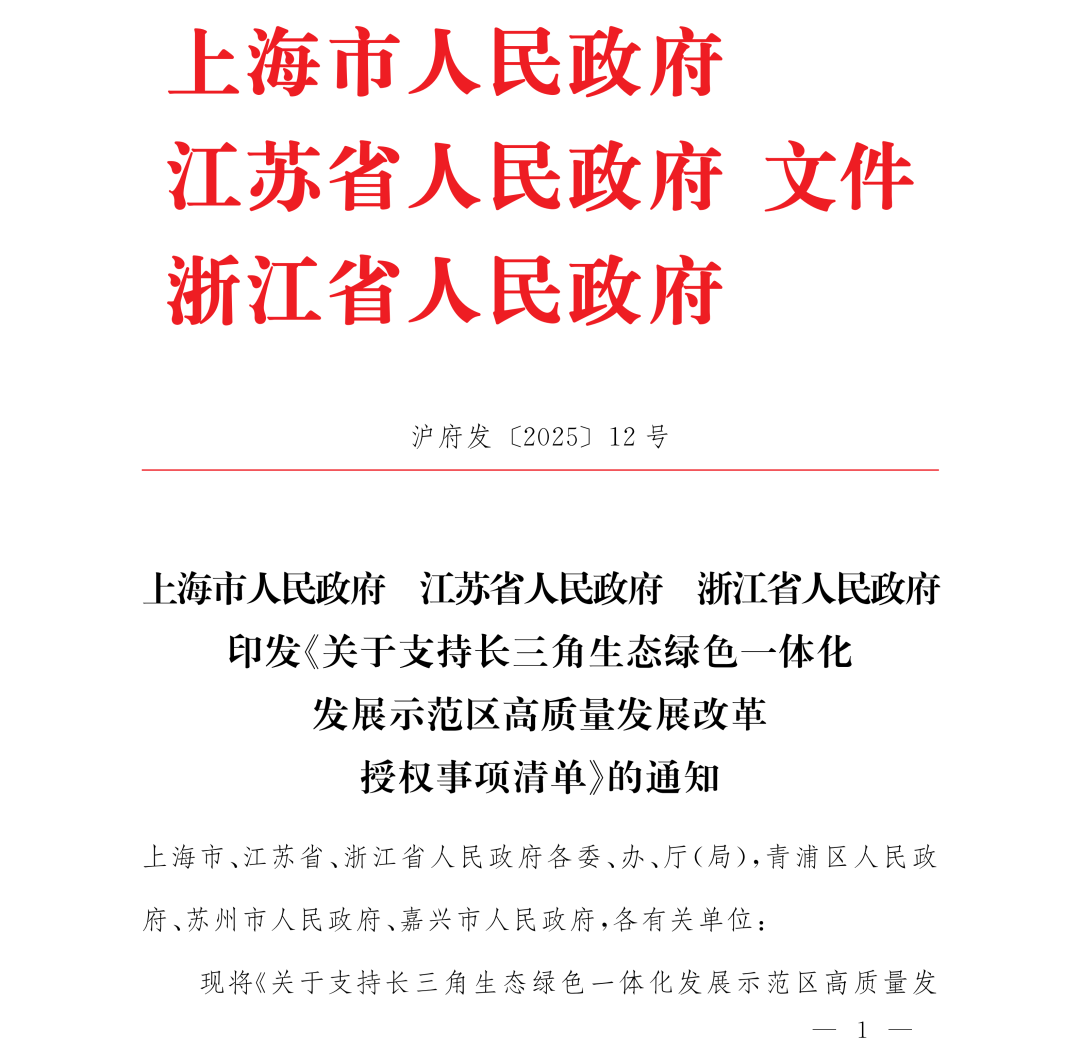 为进一步加强各项改革举措的系统集成和协同配合,发挥改革对示范区发展的保障作用,两省一市人民政府联合印发《关于支持长三角生态绿色一体化发展示范区高质量发展改革授权事项清单》,明确九项支持示范区高质量发展改革授权事项。全文如下↓