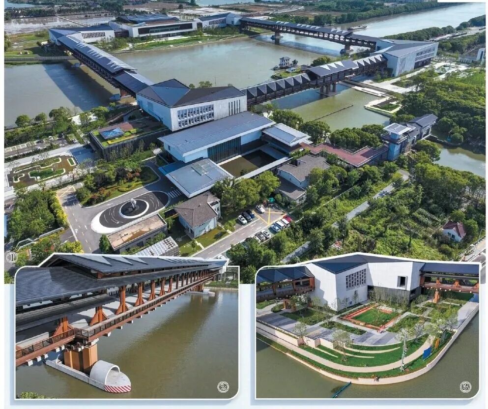 这一“点”就落在沪苏浙的分界线上。从空中俯瞰太浦河,有一处小“点”横跨两省一市,它就是长三角生态绿色一体化发展示范区的标志性建筑——方厅水院。